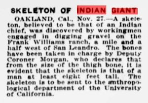 In einer kurzen Meldung (Abb. 5) der Washington Times vom 27. November 1916 heißt es: "Oakland, Kalifornien, 27. Nov. - Ein Skelett, welches man für das eines Indianer-Häuptlings hält, wurde von Arbeitern entdeckt, die mit dem Ausgraben von Kies auf Frank Williams´ Ranch, anderthalb Meilen westlich von San Leandro, beschäftigt waren. Die Knochen wurden vom stellvertretenden Gerichtsmediziner Morgan in Verwahrung genommen, der erklärt, es sei, der Größe des Oberschenkel-Knochen zufolge evident, dass das Skelett das eines mindestens acht Fuß [ca. 2,44 m; d.Ü.] großen Mannes sei. Das Skelett soll der anthropologischen Fakultät der University of California übersandt werden." [7]