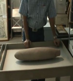 "Die sensationellen Objekte werden", wie der Autor Whyte Eagle feststellt, "sage und schreibe, in einem Hinterzimmer aufbewahrt, aber wie es in Berichten heißt, sind die Mitarbeiter gerne bereit, sie Ihnen zu zeigen, wenn Sie danach fragen!" [11] Bei dem zweiten relevanten Objekt handelt es sich um einen weit überdimensionalen Wurzel- oder Getreidestößel aus Stein (Abb. 6), der in der direkten Umgebung der Höhle entdeckt wurde. Dieses Specimen, das viel zu schwer ist, um von einem 'Normalmenschen' benutzt zu werden, wird heute im Nevada State Museum in Carson City aufbewahrt. Bezeichnender Weise ist auch dieses höchst außergewöhnliche Gerät kein Exponat, sondern wird in einem Besuchern normalerweise nicht zugänglichen Lagerraum aufbewahrt. [12]