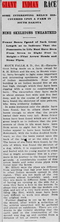 "SIOUX FALLS, South Dakota, 22. Okt. - Ausgrabungen, die auf einer Farm im Besitz von S.H. Elliott und seinem Sohn im Brown County durchgeführt wurden, haben einige wichtige Spezimen von Erzeugnissen der indianischen Moundbauer ans Licht gebracht. In der Nähe ihes [der Elliotts; d.Ü.] Gebäudes befindet sich ein fünf oder sechs Fuß [ca. 1,52 oder 1,83 m; d.Ü.] hoher indianischer Mound, durch welchen sie sich mit der Absicht gegraben haben, eine Scheune zu errichten. Die von ihnen vorgenommene Asgrabung hatte eine Breite von sechzehn Fuß [ca. 4,88 m; d.Ü.] und eine Tiefe von 5 Fuß, und im Verlauf der Grabung fanden sie die Skelette von neun Personen, welche augenscheinlich Indianer waren.