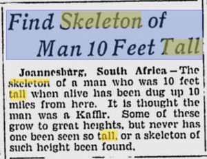 "Johannesburg, Südafrika - Das Skelett eines Mannes, der zu seinen Lebzeiten 10 Fuß [ca. 3,05 m; d.Ü.] groß war, wurde 10 Meilen [ca. 16,10 km; d.Ü.] von hier entfernt ausgegraben. Man nimmt an, dass es sich um einen Kaffer gehandelt hat. Einige von ihnen wachsen bis zu einer beträchtlichen Größe, doch niemand hat [jemals] einen gesehen, der so groß war, und es ist auch [noch] kein Skelett von solcher Größe gefunden worden." [1]