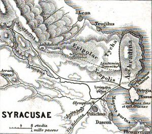 Einige Archäologen und andere Forscher [1], die Platons Atlantisbericht für erfunden halten, sehen im Hafen von Syrakus sein Vorbild für die Beschreibung der Königsinsel der Atlanter. In der Antike war Syrakus die größte und mächtigste Stadt auf Sizilien. [2] Aus dieser Zeit stammen ein aus Fels gehauenes griechisches Theater, in dem 15 000 Zuschauer Platz fanden, ein römisches Amphitheater, der große Altar von Hieron II. und die von Dionysios dem Jüngeren zu Beginn des vierten Jahrhunderts v. Chr. erbaute Zitadelle. Eine weitere Sehenswürdigkeit ist der Springbrunnen von Arethusa.