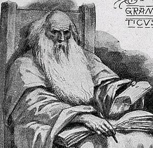 Da ist die Sage vom Helden Thorkill, die Saxo Grammaticus (Abb. 2) um 1200 unserer Zeitrechnung niederschrieb: Der nordische Seefahrer gelangt mit seinen Genossen ins Totenland Utgard (das heißt: die äußerste Stadt; ein typischer Ausdruck für Cadiz, wie >Scheria< bei Homer). Die Stadt lag damals wüst und verlassen [...] Ihre Hallen und steinernen Sitze sind so treffend beschriebene Großsteinbauten, und die reichen Goldschätze, die die Helden mitnahmen, erinnern so deutlich an Tartessos, daß die übrigen Angaben wie selbstverständlich ins Bild passen: Die Helden sahen dort sieben große Fässer, womit sicher Weinfässer gemeint waren, die die Norddeutschen nicht kannten; der König, der hier geherrscht hat, und dessen Prunkgewänder, Hut und Waffen noch dalagen, hieß Geirröd, was wie Geryon klingt.